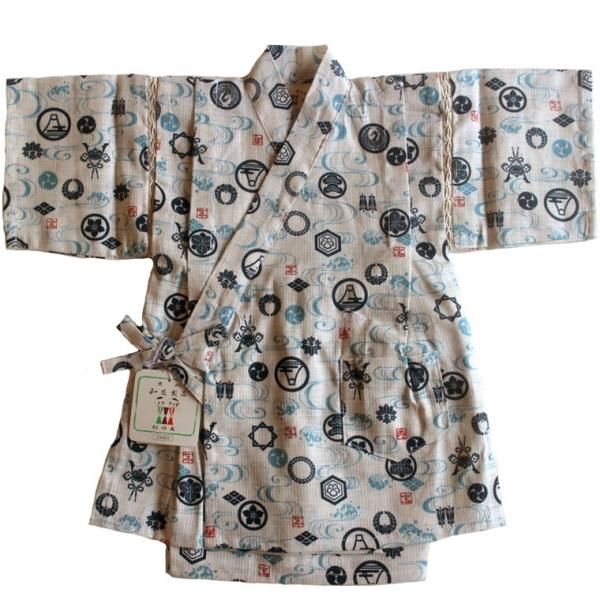 夏らしい流水模様と、日本のいろいろな家紋模様がプリントされた、かっこいい男の子甚平(日本製)です。